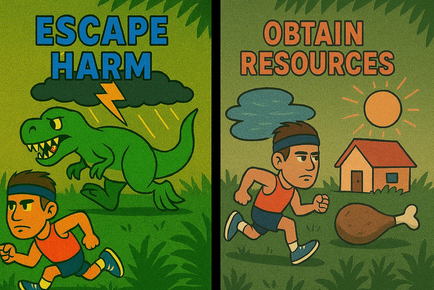 Obtaining Resources: Running helps you reach what you need to survive and reproduce faster: food before competitors get there, water before it dries up, shelter before the storm, even mates before adversaries arrive.