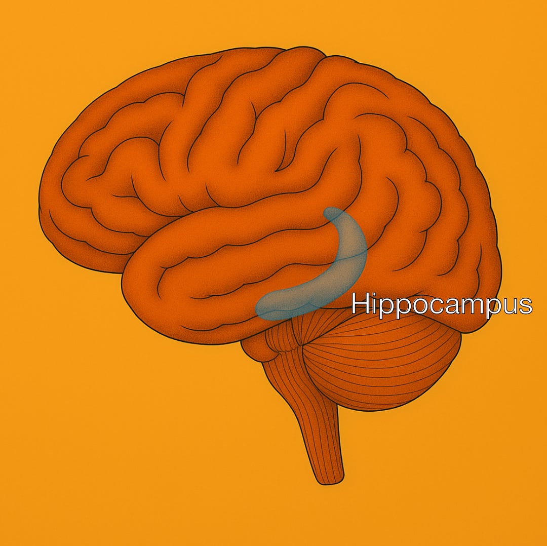 The hippocampus is a seahorse-shaped structure buried deep in the temporal lobes — tiny, but mighty. It’s best known for two things: forming new memories and mapping space. Any time you remember where you parked, replay last night’s conversation, or navigate a familiar trail, thank your hippocampus.