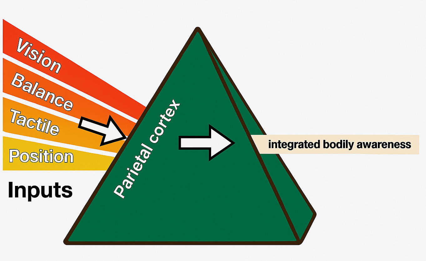 You know how white light can be split into separate colors? The parietal cortex is like that — except instead of splitting the colors (vision, balance, tactile feedback, body position), it fuses them into one cohesive internal experience.
