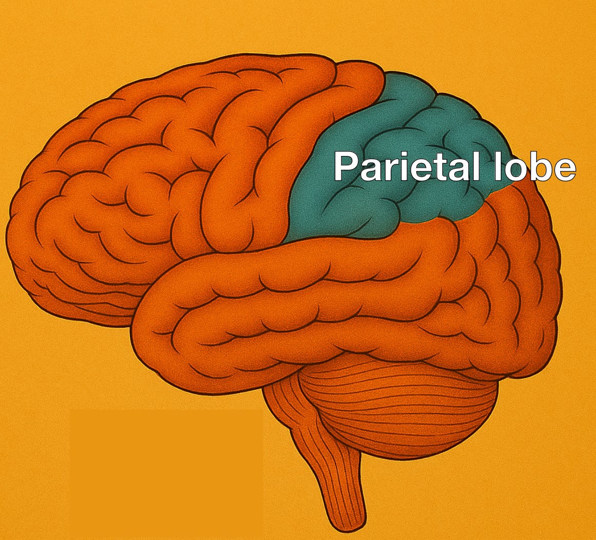Cerebellum be gone. Much later in evolution, the parietal cortex emerged. For orientation, this sits on the brain’s outer layer — the neocortex — near the top‑back of the head, above the cerebellum. It acts as an integration hub for sensory information, building a constantly updating spatial map of where and how you are relative to the world. This bad boy is how you know where your limbs are without looking, how to reach for moving objects without thinking twice about it, and also why Steve of FIJI College Lore could throw this football over them mountains (judge distances), perhaps the most decent thing Steve was capable of. The parietal cortex fuses vision, balance, tactile feedback, and body position into a single internal experience that answers, What’s around me? Where am I? Am I balanced? Where am I going?