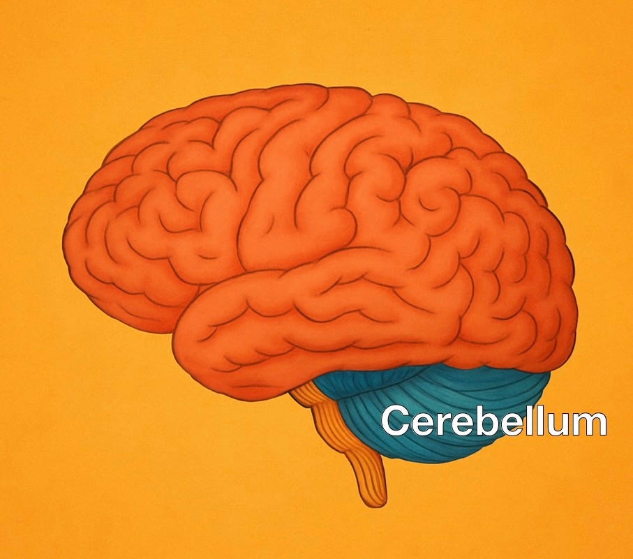 The cerebellum, an ancient structure hundreds of millions of years old, sits tucked at the back and base of the brain. Its job is to fine-tune timing and coordination. If you’re unfamiliar, think of the cerebellum as a real-time quality-control system for movement. It doesn’t decide what you’re going to do — that plan comes from other brain regions. What it does is constantly compare that plan to what’s actually happening in your body and in the environment. Is your foot landing where it should? Is the ground shifting? Are you off balance? It’s the movement auditor.* (Shoutout accountants.)
