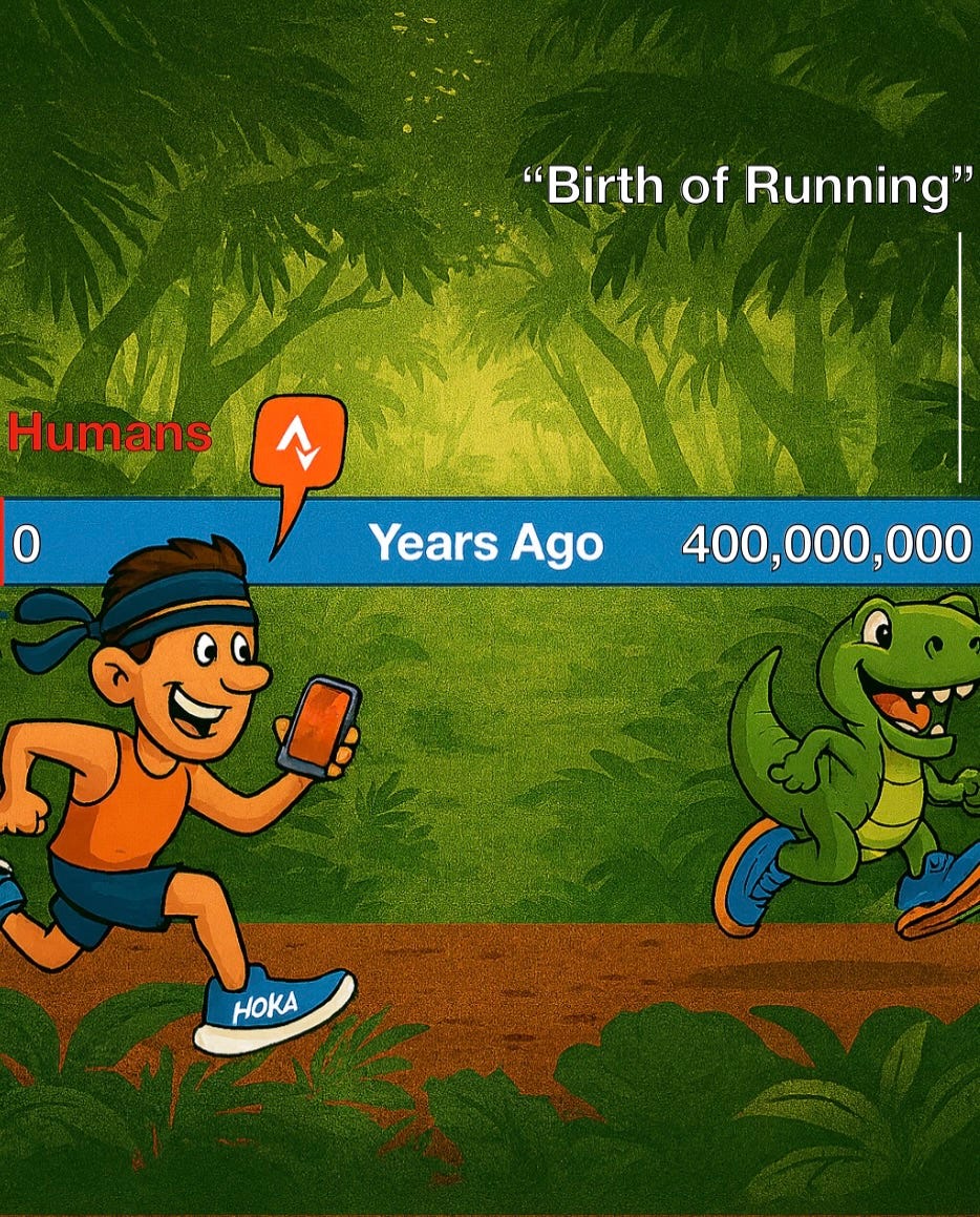 On the far left of the timeline, there’s a thin red line showing how long humans have existed compared to how long running has. It’s so thin you might not even notice it — blink and you’ll miss our entire species, existential FOMO of a sort.